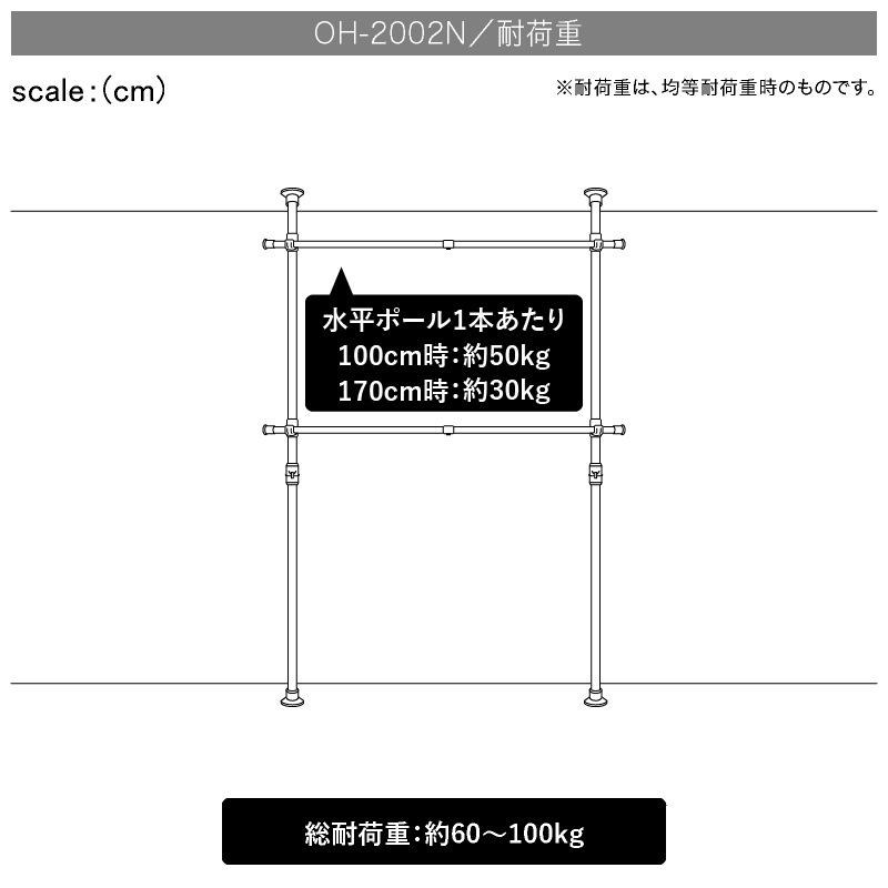 -水平ポール100cm時:1本あたり50kg -水平ポール170cm時:1本あたり30kg ※耐荷重は均等荷重時のものです。 |