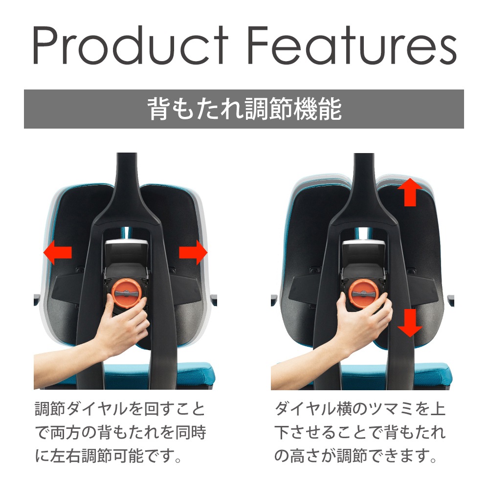 また、左右独立して動く二つの背もたれが腰にピッタリ添えて