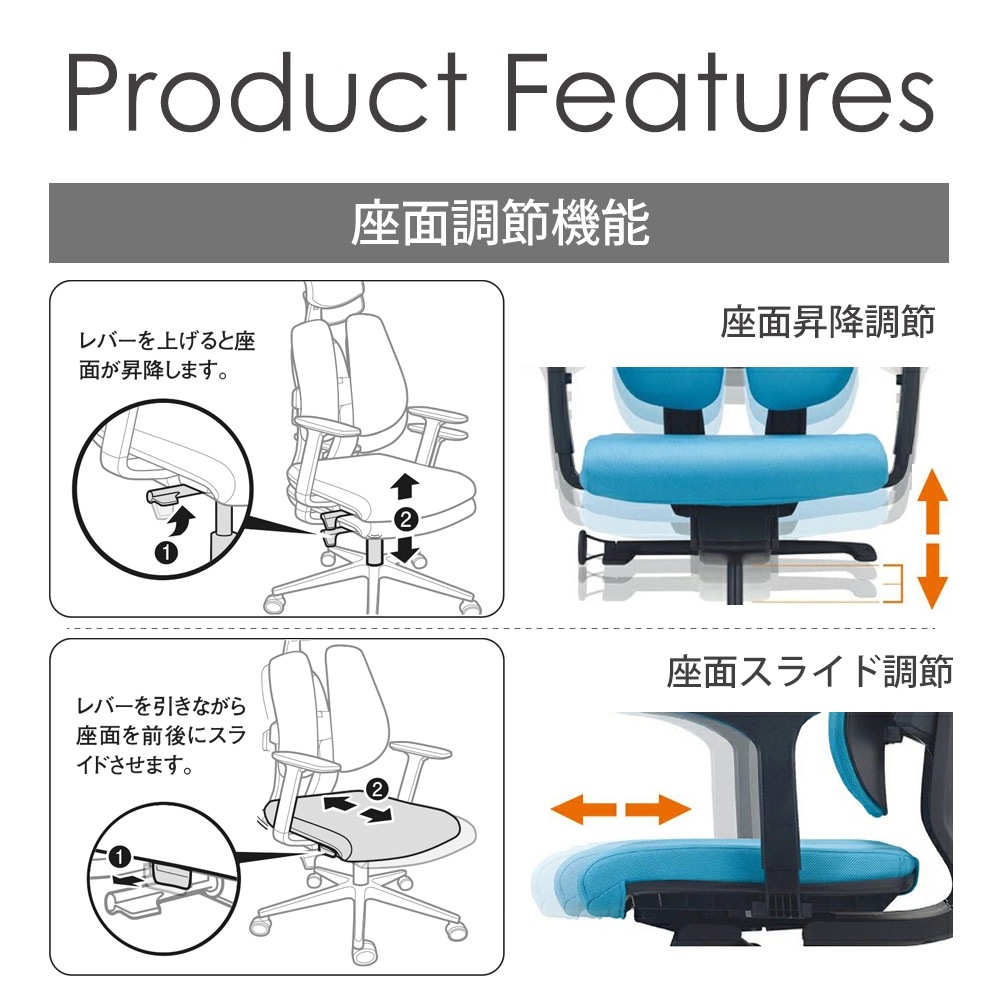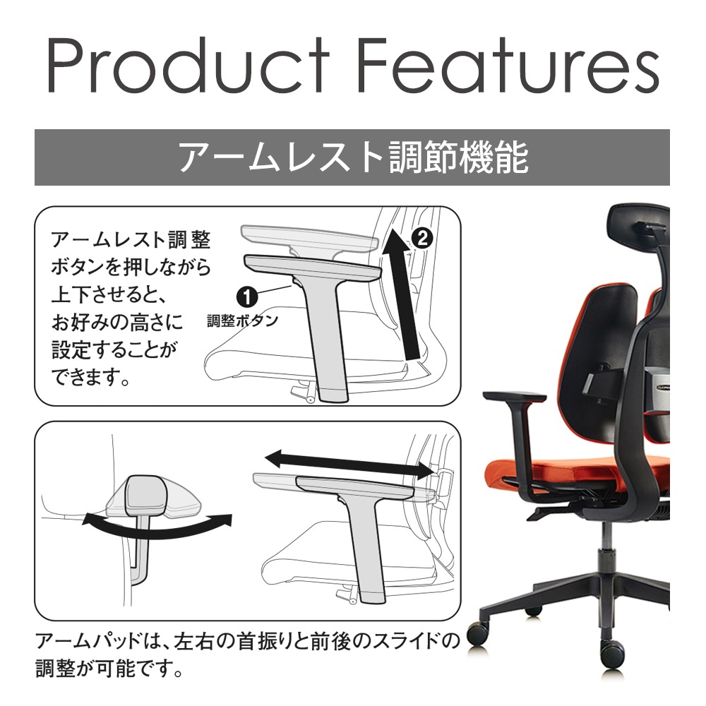 座ガス圧昇降/セルフチルト/シンクロリクライニング/アームレスト前後スライド・首振り・高さ調節/背もたれ位置調節/ヘッドレスト高さ調節/座前後スライド/ウレタン双輪キャスター |