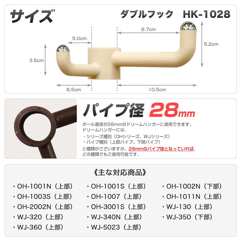 パイプ径28mm対応のダブルフック(L字型フック)