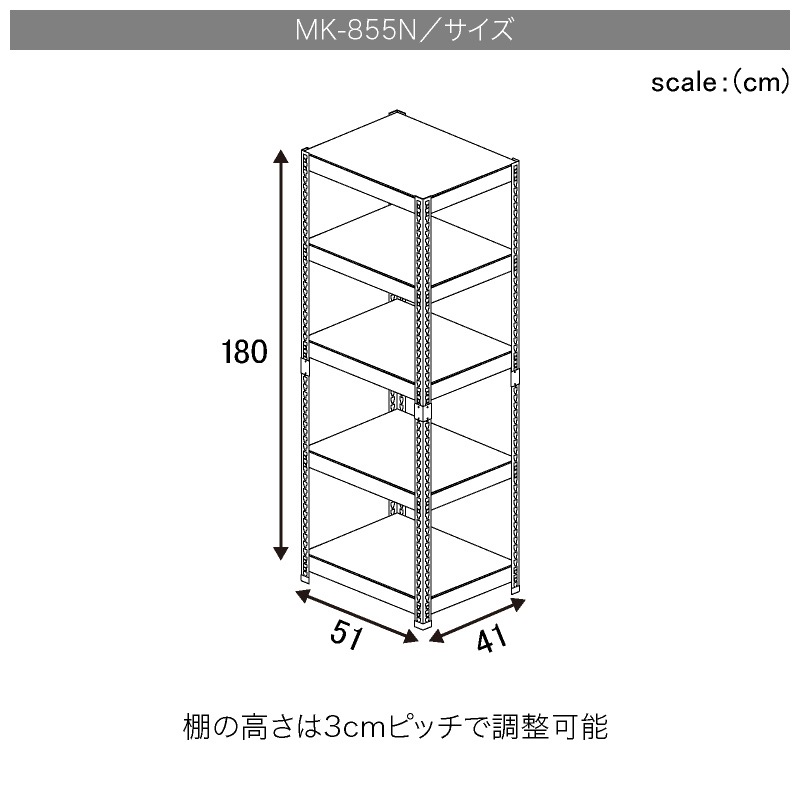 幅51cm、奥行41cm、高さ180cmとコンパクトながら、総耐荷重250kgの頑丈さが自慢です。