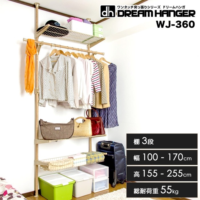 「ドリームハンガー ワンタッチ式突っ張りポールハンガーラック3段 WJ-360」は伸縮式クローゼットや壁面収納として幅広く活用できる便利なアイテムです。