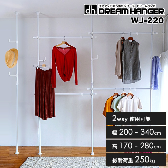【簡単】ワンタッチ式突っ張りポールハンガーラック2段 高さ170-280cm 幅100-170cm 総耐荷重100kg ドリームハンガー WJ-120