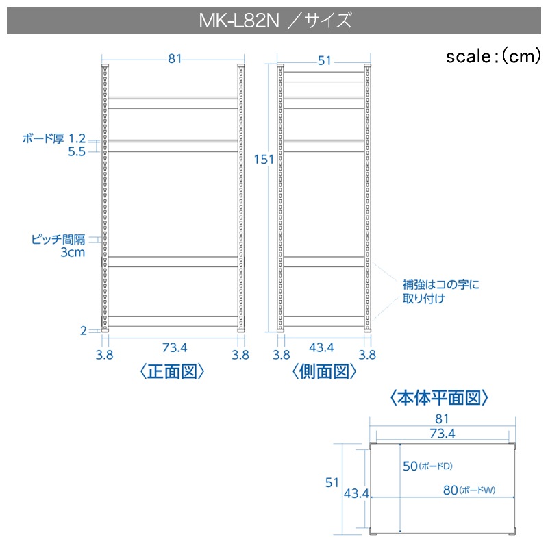幅82cm、奥行51cm、高151cmというコンパクトなサイズながらも、ボードは1枚あたり耐荷重30kg。