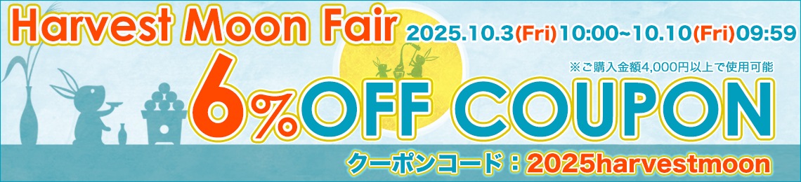 ![]() ♥誰でも使える 6%OFFクーポン ・利用期間:10月3日(金)10:00~10月10日(金)09:59 ・クーポンコード:2025harvestmoon ※ご購入金額4,000円以上で使用可能(送料除く) |