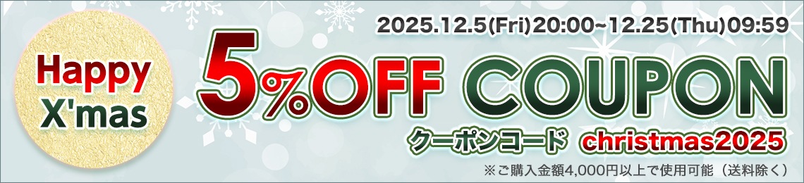 ![]() ♥誰でも使える 5%OFFクーポン ・利用期間:12月5日(金)20:00~12月25日(木)09:59 ・クーポンコード:christmas2025 ※ご購入金額4,000円以上で使用可能(送料除く) |