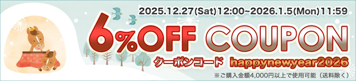 ![]() ♥誰でも使える 6%OFFクーポン ・利用期間:2025年12月27日(土)12:00~2026年1月5日(月)11:59 ・クーポンコード:happynewyear2026 ※ご購入金額4,000円以上で使用可能(送料除く) |
